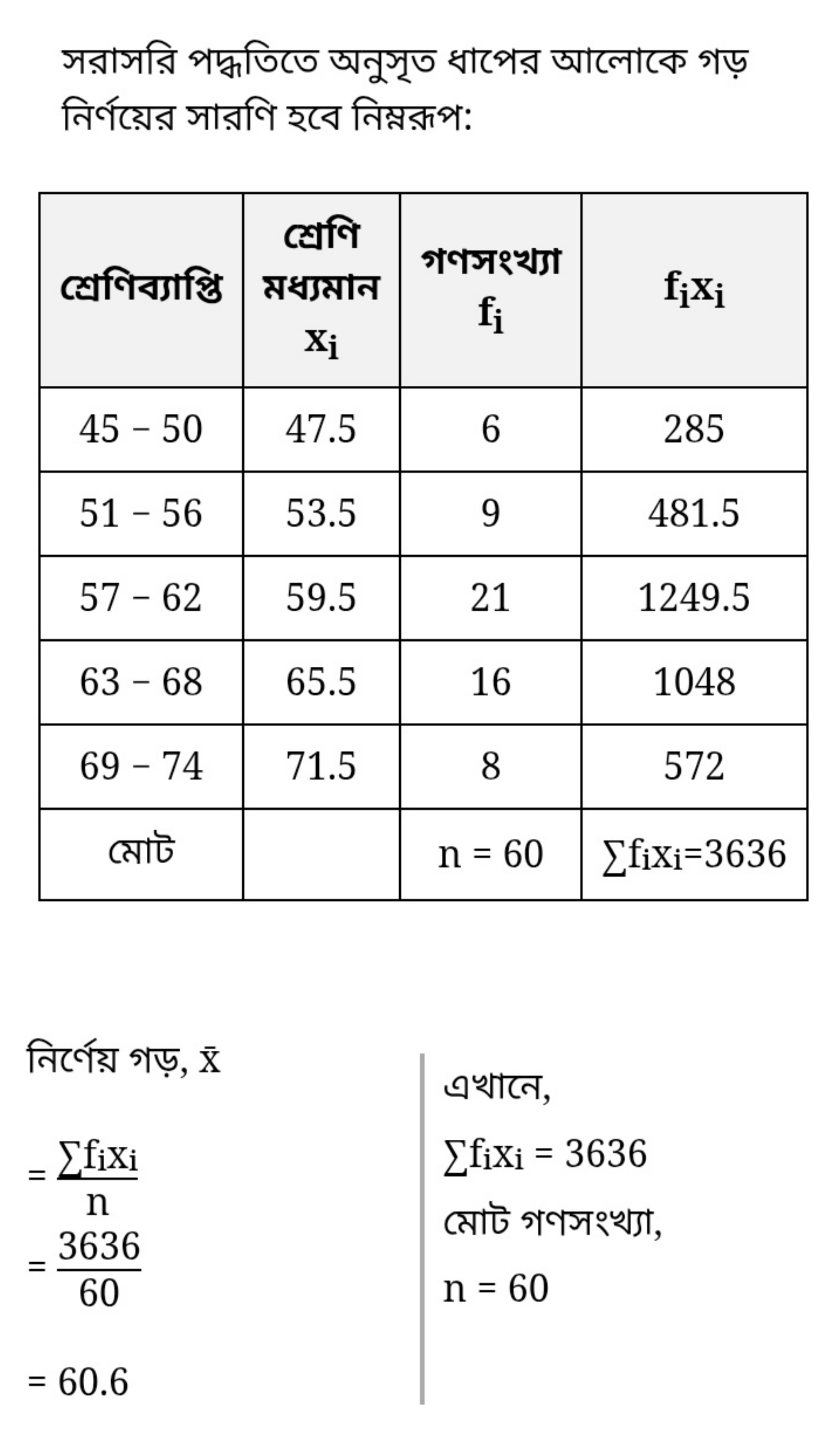 সরাসরি পদ্ধতিতে অনুসৃত ধাপের আলোকে গড় নির্ণয়ের সারণি হবে নিম্নরূপ: